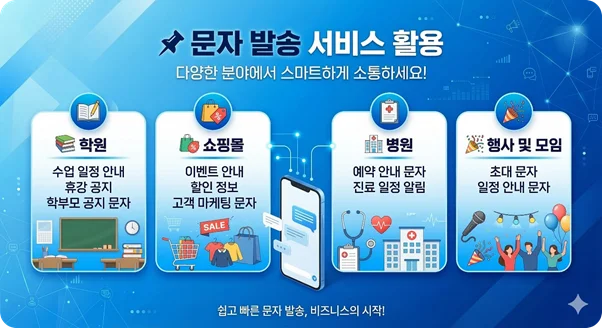 예를 들어 학원에서는 학부모 공지 문자를 보내거나, 쇼핑몰에서는 이벤트 안내 문자를 보내는 방식으로 활용할 수 있습니다.